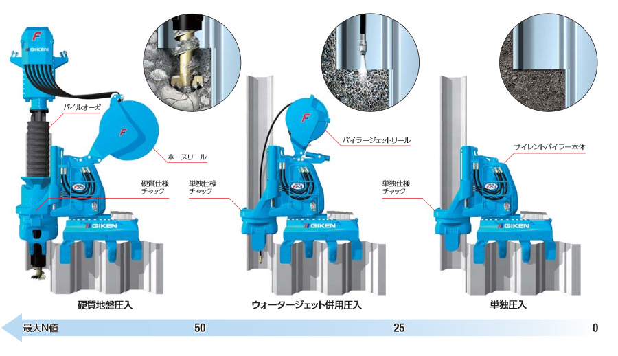 特に玉石混じりの砂礫層などの場合、単独圧入はもちろんのこと、ウォータージェット補助併用工法でも十分な効果は発揮できません。この硬質地盤を、オーガ削孔と連動させ無振動・無騒音などの圧入の優位性